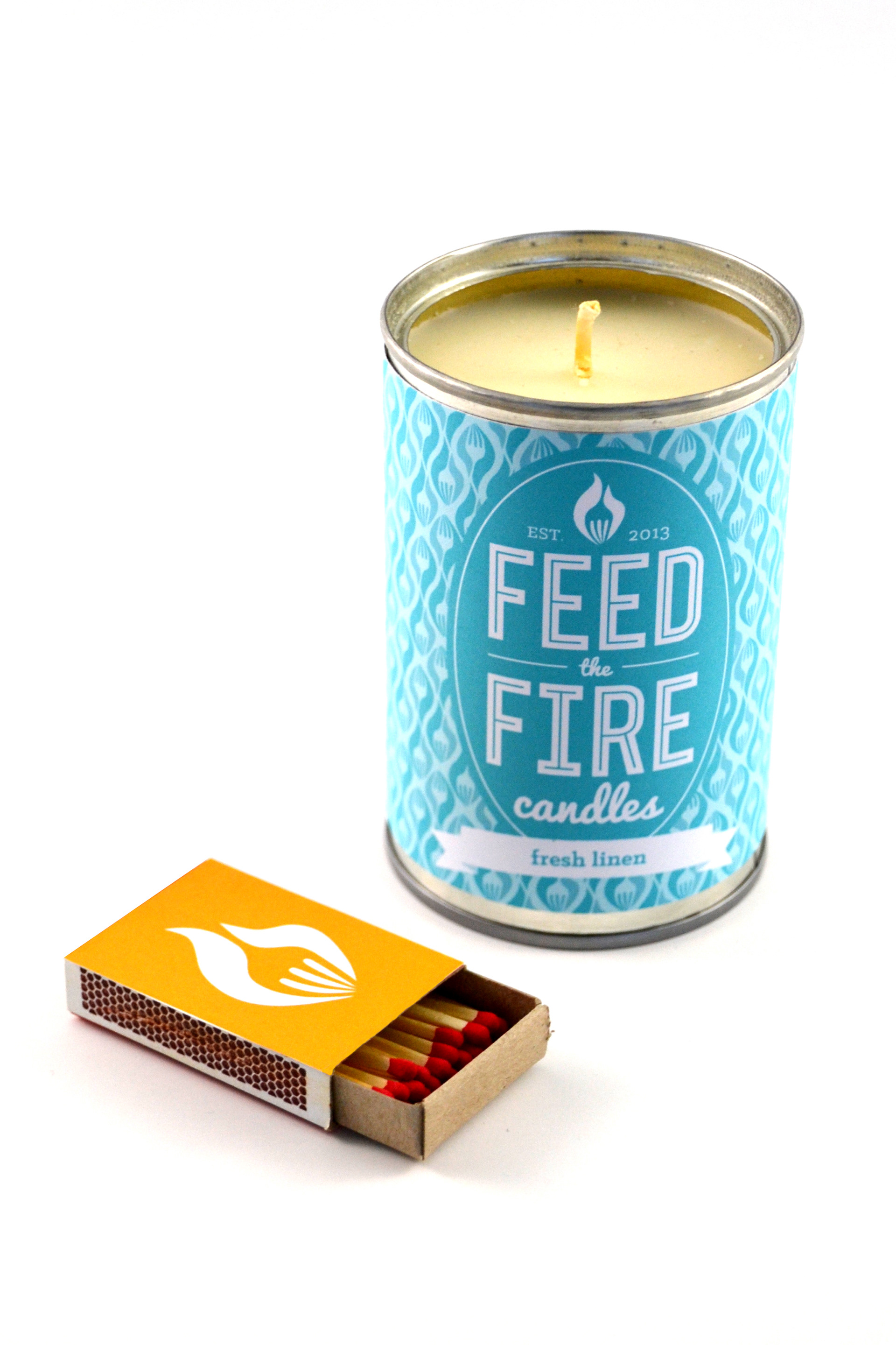 Brand redesign of startup company, Feed the Fire Candles, who wants to help fight hunger with candles handmade in recycled cans. They donate four meals per candle purchase to a local soup kitchen.